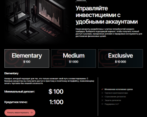 Типы счетов: прогрессия от базового (тест) до VIP (элита). Минимальный депозит $100; бонусы и страховка для VIP.