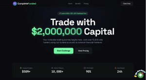 Complete Funded позиционируется как современная проп-компания, предлагающая трейдерам доступ к капиталу до $2 000 000, профит-сплит до 90%+, «неограниченное время» на выполнение условий и «мгновенное финансирование». На сайте используются формулировки о $50M+ funded capital, 10 000+ активных трейдерах, крупных выплатах и круглосуточной поддержке.