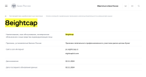 Также важно учитывать, что для работы с клиентами из России брокер должен иметь разрешение или действовать в рамках законодательства РФ. В реестре Центральный банк Российской Федерации отсутствует информация о лицензии Eightcap на осуществление профессиональной деятельности на рынке ценных бумаг в России.