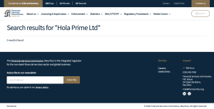 Однако проверка реестра Financial Services Commission Mauritius по названию Hola Prime Ltd не показывает лицензированной структуры с таким именем
