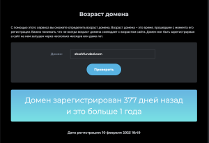 Домен sharkfunded.com зарегистрирован 10 февраля 2025 года. На февраль 2026 года проекту чуть больше одного года (около 12–13 месяцев).