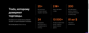 Tradu активно продвигается как глобальный мультиактивный брокер с 25-летней историей, строгим регулированием и миллионами клиентов по всему миру. На сайте заявлены 8000+ американских акций, CFD на индексы, криптовалюты, металлы, единый счёт, «нулевые комиссии», интеграция с TradingView и высокий рейтинг 4.8/5 на Trustpilot.
